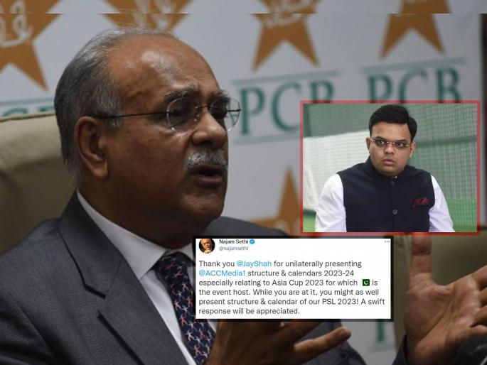 नजम सेठी यांनी ट्विट करत जय शाह यांचा समाचार घेतला. आशिया चषक २०२३ चे यजमानपद पाकिस्तानकडे आहे, मात्र त्यांनी एकट्याने निर्णय घेतला असल्याचे त्यांनी सांगितले. जेव्हा तुम्ही खूप काही करत असाल, तेव्हा तुम्ही पाकिस्तान सुपर लीग २०२३ चे वेळापत्रकही जाहीर करा, असा टोला त्यांनी जय शाह यांना मारला.