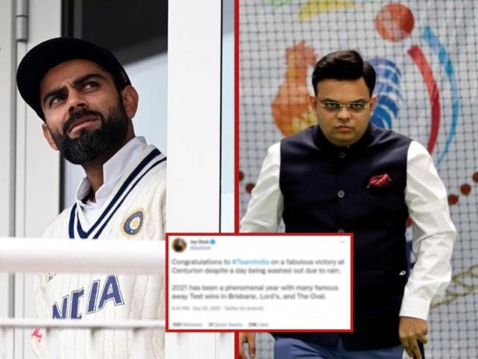 IND beat SA 1st Test: BCCI secretary Jay Shah tweet goes viral : भारतीय संघानं पहिल्या कसोटीत यजमान दक्षिण आफ्रिकेवर ११३ धावांनी विजय मिळवून तीन सामन्यांच्या मालिकेत १-० अशी आघाडी घेतली. या विजयासह भारतीय संघानं २०२१चा शेवट गोड केला अन् आफ्रिकेत पहिल्या कसोटी मालिका विजयाच्या दिशेनं दमदार पाऊल टाकलं. भारतानं विजयासाठी ठेवलेल्या ३०५ धावांच्या लक्ष्याचा पाठलाग करताना आफ्रिकेचा दुसरा डाव १९१ धावांवर गडगडला. या विजयानंतर BCCI सचिव जय शाह ( Jay Shah) यांनी टीम इंडियाचे कौतुक केलं, परंतु त्यांच्या या ट्विटमधून Virat Kohli Vs BCCI हा सामना अद्याप सुरू असल्याचे दिसले.