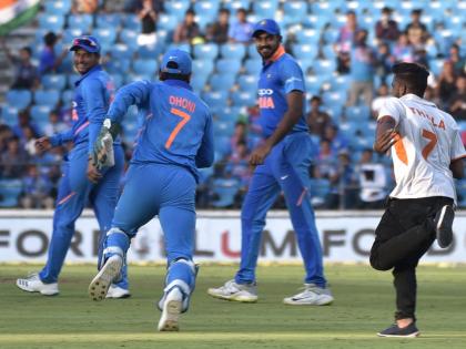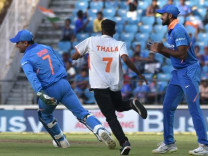 धोनीच्या जर्सीचा नंबर सात आहे. याच क्रमांकाची पांढऱ्या रंगाची जर्सी या चाहत्याने परीधान केली होती. हा चाहता जेव्हा मैदानात धावत आला तेव्हा धोनीने त्याला पाहिले. हा चाहता जेव्हा धोनीच्या जवळ आला तेव्हा धोनी त्याला पाहून थोडा पुढे पळाला. यावेळी संघ सहकाऱ्यांमध्ये चांगलाच हशा पिकला. पण धोनीने या चाहत्याला नाराज केले नाही. धोनीने या चाहत्याला आपल्या जवळ बोलावले. त्यावेळी या चाहत्याने धोनीचे पाय धरले.