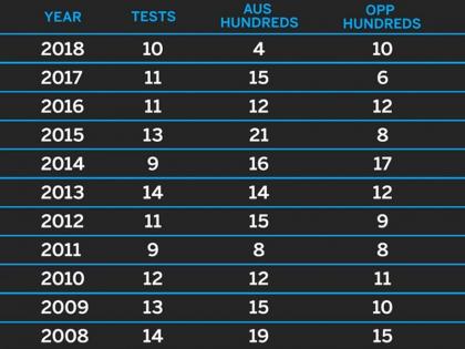 शतकांच्या बाबतीत सरते वर्ष ऑस्ट्रेलियासाठी निराशाजनक राहिले आहे. दहा कसोटीत ऑस्ट्रेलियाकडून केवळ चारच शतकं झाली आहेत, त्याउलट प्रतिस्पर्धींनी दहा शतकं ठोकली आहेत. 2014 नंतर प्रथमच ऑस्ट्रेलियाच्या शतकांचा आकडा हा प्रतिस्पर्धींपेक्षा कमी राहिला आहे.