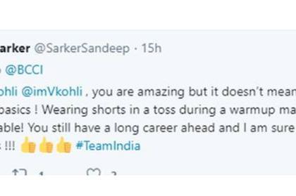 सराव सामन्यासाठी कोहली जेव्हा नाणेफेकीसाठी आला तेव्हा साऱ्यांनीच भुवया उंचावल्या. कारण कोहली यावेळी चक्क हाफ पँटमध्ये नाणेफेकीसाठी आला होता. त्यानंतर त्याला चाहत्यांनी चांगलेच घारेवर धरले. तुम्ही कितीही मोठे खेळाडू असलात तरी खेळाचा मान तुम्ही ठेवायलाच हवा, असे खडे बोल चाहत्यांनी विराटला सुनावले आहेत.