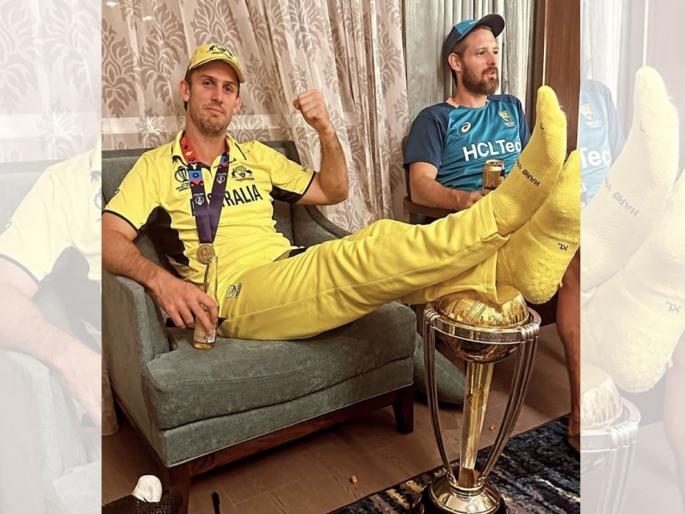 वर्ल्ड कप जिंकणाऱ्या संघाचा भाग होणं, हे प्रत्येक क्रिकेटपटूचं स्वप्न असतं. हे स्वप्न साकार झाल्यानंतर खेळाडू या ट्रॉफीसोबत फोटोसेशन करतात. तसंच काही खेळाडू तर ट्रॉफीचं चुंबन घेत आपला आनंद साजरा करतात. फुटबॉल वर्ल्ड कप जिंकल्यानंतर स्टार फुटबॉलपटू लिओनल मेस्सी हा रात्रभर ट्रॉफीसोबत झोपल्याचा फोटोही व्हायरल झाला होता. परंतु काल अहमदाबादच्या नरेंद्र मोदी स्टेडियमवर वर्ल्ड कप जिंकल्यानंतर ऑस्ट्रेलियाच्या मिशेल मार्शचा ट्रॉफीसोबतचा फोटो सोशल मीडियात प्रचंड व्हायरल झाला आहे. या फोटोत मिशेल मार्श हा चक्क ट्रॉफीवर पाय ठेवून बसल्याचं दिसत आहे.