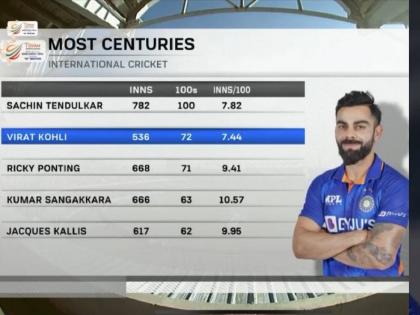 विराटने ऑगस्ट २०१९नंतर वन डे क्रिकेटमध्ये शतक झळकावले. जवळपास १२०० हून अधिक दिवसानंतर विराटने शतक झळकावले आणि रिकी पाँटिंग व सचिन तेंडुलकर यांचे विक्रम मोडले. विराटचे हे वन डे क्रिकेटमधील ४४ वे शतक ठरले. त्याने सर्वात कमी २५६ डावांत ४४ शतक झळकावताना सचिन तेंडुलकरच्या ४१८ डावांत ४४ शतकांचा विक्रम मोडला. विराट ९१ चेंडूंत ११ चौकार व २ षटकारांसह ११३ धावांवर माघारी परतला. विराटचे हे ७२वे आंतरराष्ट्रीय शतक ठरले आणि त्याने पाँटिंगला ( ७१) मागे टाकले.