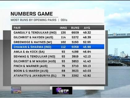 शिखर धवन व रोहित ही जोडी बऱ्याच कालावधीनंतर पुन्हा एकदा वन डेत सलामीला खेळताना दिसली. या दोघांनी मिळून ६ धावा करताना वन डेत सलामीवी म्हणून ५००० धावांचा पल्ला पार केला. असा पराक्रम करणारी ही चौथी जोडी ठरली. धवनचा हा १५०वा सामना आहे. सौरव गांगुली-सचिन तेंडुलकर यांनी ६६०९ धावा, अॅडम गिलख्रिस्ट-मॅथ्यू हेडन यांनी ५३७२ धावा, गॉर्डन ग्रिनीज-डी हायनेस यांनी ५१५० धावा केल्या आहेत. भारताने ११ षटकांत बिनबाद ५६ धावा केल्या आहेत. डेव्हिड विलीने टाकलेल्या चौथ्या षटकाच्या तिसऱ्या चेंडूवर रोहितने फाईन लेगच्या दिशेने खणखणीत सिक्स मारला. पण, तो चेंडू प्रेक्षकांमध्ये उपस्थित मुलीला लागला. त्याचवेळी तिथे उपस्थित असलेल्या इंग्लंड संघाच्या वैद्यकीय टीमने धाव घेत उपचार केले.