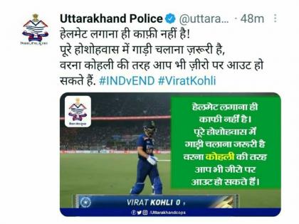 Ind Vs Eng 1st T20 Live Update Score : कसोटी मालिकेतील दमदार विजयानंतर ट्वेंटी-20 मालिकेत मैदानावर उतरलेल्या टीम इंडियाला पहिल्याच सामन्यात इंग्लंडकडून पराभव पत्करावा लागला. रोहित शर्माला ( Rohit Sharma) विश्रांती देऊन नवी सलामीची जोडी मैदानावर उतरवण्याचा विराट कोहलीचा ( Virat Kohli) डाव फसला. शिखर धवन, लोकेश राहुल व विराट कोहली हे तिघेही फलकावर २० धावा असताना माघारी परतले. विराट ( Virat) आदिल राशिदच्या गोलंदाजीवर शून्यावर झेलबाद होऊन माघारी परतला. उत्तराखंड पोलिसांनी मग विराटला ट्रोल करताना लोकांना महत्त्वाचा संदेश दिला. ( Uttarakhand police trolled Virat Kohli )