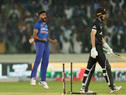 मोहम्मद सिराजने भारताला विकेट मिळवून दिली. कॉनवे ( १०) धावांवर बाद झाला. सिराजला प्रत्यक्ष खेळताना पाहण्यासाठी त्याचे कुटुंबीय स्टेडियममध्ये उपस्थित होते. हेन्री निकोल्स ( १८) व डॅरील मिचेल ( ९) यांना कुलदीप यादवने बाद केले. फिनला ४० धावांवर शार्दूल ठाकूरने माघारी पाठवले, शाहबाज अहमदने सुरेख झेल टिपला. मोहम्मद शमीने किवींचा पाचवा फलंदाज माघारी पाठवला. ग्लेन फिलिप्स ( ११) माघारी परतल्याने पाहुण्यांची अवस्था ५ बाद ११० अशी झाली.