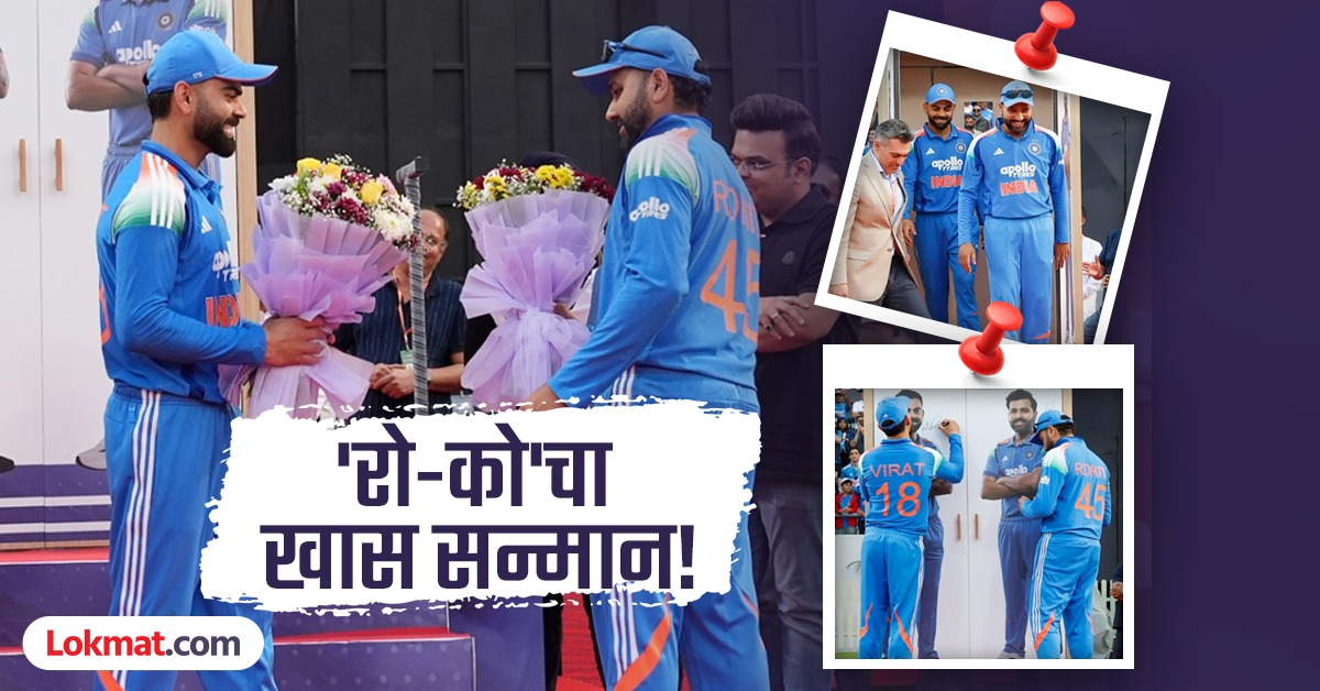 Web Summary : IND vs NZ मैच के दौरान, वडोदरा के नए स्टेडियम में रोहित शर्मा और विराट कोहली को सम्मानित किया गया। वे एक अलमारी से निकले, उस पर हस्ताक्षर किए, और एक विशेष समारोह में गुलदस्ते प्राप्त किए। इस अनोखे पल का वीडियो वायरल हो रहा है।