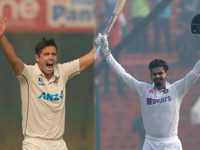 India vs New Zealand , 1st Test Live Upadets : टीम इंडियाकडून श्रेयस अय्यर ( Shreyas Iyer) आणि न्यूझीलंडकडून टीम साऊदी ( Tim Southee) यांनी कानपूर कसोटीचा दुसरा दिवस गाजवला. २०१७नंतर कसोटी संघात स्थान पटकावताना पदार्पण करणाऱ्या श्रेयसनं शतक झळकावून टीम इंडियाचा डाव सावरला. त्याला रवींद्र जडेजाची उत्तम साथ लाभली. पण, सुरुवातीच्याच काही षटकांत टीम साऊदीनं भारताला चार धक्के दिले आणि पाच विकेट्स पूर्ण केल्या. १९८०नंतर कानपूर कसोटीत पाच विकेट्स घेणारा तो पहिला परदेशी जलदगती गोलंदाज ठरला. आर अश्विननं  तळाच्या फलंदाजांना सोबत घेऊन संघर्ष केला अन् टीम इंडियाला समाधानकारक पल्ला गाठून दिला.