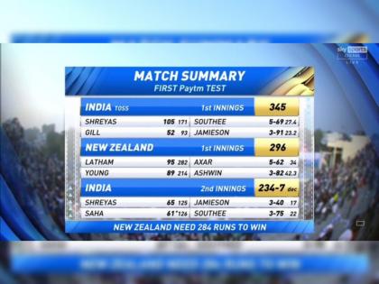 रवींद्र जडेजा (५०), शुबमन गिल ( ५२) आणि श्रेयस अय्यर ( १०५) यांच्या दमदार खेळीनंतरही भारताला ३४५ धावांवर समाधान मानावे लागले. प्रत्युत्तरात न्यूझीलंडचे सलामीवीर टॉम लॅथम व विल यंग यांनी पहिल्या विकेटसाठी १५१ धावांची भागीदारी केली. पण, तिसऱ्या दिवशी अक्षर पटेलनं त्यांना बॅकफूटवर फेकले. यंग ८९ आणि लॅथम ९५ धावांवर बाद झाले. त्यांच्यानंतर कायले जेमिन्सन ( २३) हा किवींकडून सर्वाधिक धावा करणारा फलंदाज ठरला. अक्षर पटेलनं ६२ धावांत ५ विकेट्स घेतल्या. आर अश्विननं ८२ धावांत ३ बळी टिपले. किवींना पहिल्या डावात २९६ धावाच करता आल्या.
