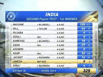 ४ बाद २२१ वरून भारतानं आज डावाची सुरूवात केली. परंतु दुसऱ्या दिवसाच्या पहिल्याच षटकात एजाझनं सहाला ( २७) पायचीत केलं अन् पुढच्याच चेंडूवर आर अश्विनला अप्रतिम चेंडूवर त्रिफळाचीत केलं. अक्षर व मयांक यांनी सातव्या विकेटसाठी दमदार खेळ केला. ही जोडी तोडण्यासाठी टीम साऊदी, कायले जेमिन्सन, विलियम सोमरविले या सर्वांनी प्रयत्न केले, परंतु अखेर यश एजाझ पटेललाच मिळाले. त्यानं लंच ब्रेकनंतर पटेलनं मोठी विकेट घेतली. मयांक ३११ चेंडूंत १७ चौकार व ४ षटकारांसह १५० धावांवर माघारी परतला. अक्षरनं ११३ चेंडूंत कसोटीतील पहिले अर्धशतक पूर्ण केले. पण, एजाझनं पुन्हा खोडा घातला, अक्षरला ५२ धावांवर पायचीत केले. त्यानंतर जयंत यादव व मोहम्मद सिराज यांची विकेट घेत एजाझनं इतिहास रचला. भारताचा पहिला डाव ३२५ धावांवर गुंडाळला.