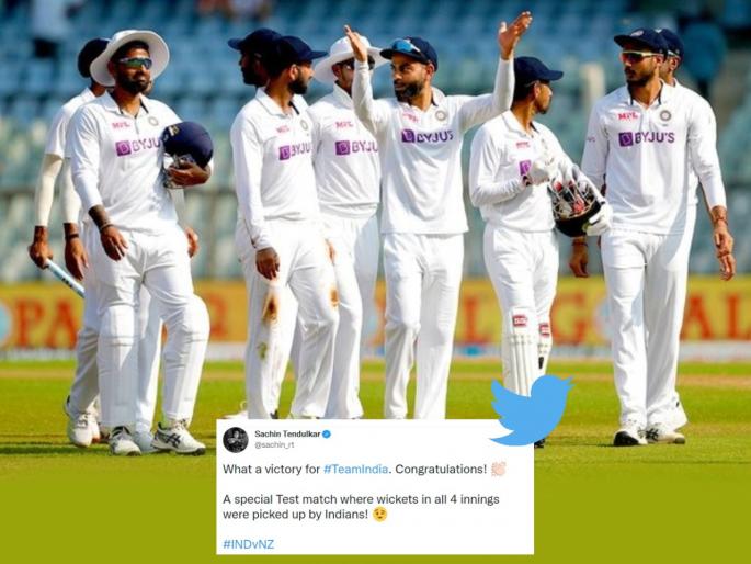 सचिन तेंडुलकरनं ट्विट केलं की, ''या विजयाबद्दल भारतीय संघाचे अभिनंदन. ही स्पेशल कसोटी मॅच ठरली, कारण चारही डावांत भारतीय गोलंदाजांनी सर्व विकेट्स घेतल्या.''