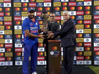 India vs New Zealand, 3rd ODI Live : भारतीय संघाने तिसऱ्या वन डे सामन्यात ९५ धावांनी न्यूझीलंडवर विजय मिळवला. भारताच्या ३८५ धावांचा पाठलाग करताना न्यूझीलंडचा संघ २९५ धावांवर तंबूत परतला. भारताने ही मालिका ३-० अशी जिंकून आयसीसी वन डे क्रमवारीत अव्वल स्थानी झेप घेतली. भारतीय संघ ट्वेंटी-२०तही अव्वल स्थानावर आहे आणि कसोटीत दुसऱ्या क्रमांकावर आहे. ऑस्ट्रेलियाविरुद्धची मालिका जिंकून भारताला कसोटीत अव्वल येण्याची संधी आहे. मालिका विजयानंतर रोहितने विजयी चषक युवा खेळाडूच्या हाती देण्याची परंपरा कायम राखली. या मालिकेत संघात नाव असूनही एकही सामना खेळण्याची संधी न मिळालेल्या खेळाडूच्या हाती रोहितने चषक सोपवला.
