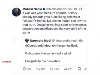 दरम्यान, भारताच्या विजयानंतर पंतप्रधान नरेंद्र मोदी यांनी X वर लिहिले होते, "मैदानावर ऑपरेशन सिंदूर. निकाल सारखाच आहे - भारत जिंकला! आमच्या क्रिकेट संघाचे अभिनंदन." मोहसिन नक्वी यांनी X वर यावर प्रतिक्रिया दिली.