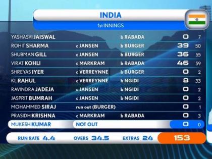 सामन्याला खरी कलाटणी ३४व्या षटकात मिळाली. लुंगी एनगिडीने एकाच षटकात लोकेश राहुल (८), रवींद्र जडेजा ( ०) व जसप्रीत बुमराह ( ०) यांना माघारी पाठवले. पुढच्याच षटकात कागिसो रबाडाने विराटची ( ४६) विकेट मिळवून दिली. त्यानंतर मोहम्मद सिराज रन आऊट झाला आणि प्रसिद्ध कृष्णा ( ०) झेल देऊन माघारी परतला. आफ्रिकेने भारताचा डाव १५३ धावांवर गुंडाळला. भारताला पहिल्या डावात ९८ धावांची आघाडी घेता आली.