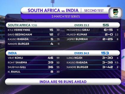 मोहम्मद सिराजने ( Mohammed Siraj ) दुसऱ्या कसोटीत ९-३-१५-६ अशी भन्नाट गोलंदाजी करून दक्षिण आफ्रिकेला शरणागती पत्करण्यास भाग पाडले. जसप्रीत बुमराह व मुकेश कुमार यांनी प्रत्येकी २ विकेट्स घेऊन आफ्रिकेचा पहिला डाव १२१ मिनिटांत ५५ धावांत गुंडाळला. भारताविरुद्ध कोणत्याही संघाची कसोटीतील ही सर्वात निचांक कामगिरी ठरली. डेव्हिड बेडिंगहॅम ( १२) व कायले वेरेयने ( १५) वगळल्यास एकाही फलंदाजाला दुहेरी धावसंख्या करता आली नाही. आफ्रिकेचा पहिला डाव २३.२ षटकांत अवघ्या १२१ मिनिटांत ५५ धावांवर गडगडला. यापूर्वी २००८मध्ये भारताचा पहिला डाव २० षटकांत ११० मिनिटांत ७६ धावांवर गुंडाळला गेला होता आणि डेल स्टेनने २३ धावांत ५ विकेट्स घेतल्या होत्या.