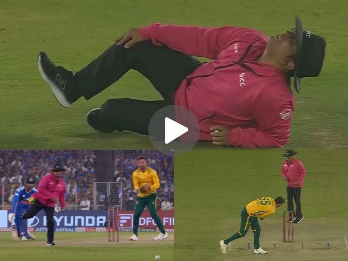 IND vs SA 5th Sanju Samson's Powerful Shot Injures Umpire Rohan Pandit : भारत–दक्षिण आफ्रिका यांच्यातील पाचवा आणि अखेरचा टी-२० सामना अहमदाबाद येथील नरेंद्र मोदी स्टेडियमवर रंगल्याचे पाहायला मिळाले. या सामन्यात शुभमन गिलच्या जागेवर प्लेइंग इलेव्हनमध्ये संधी मिळालेल्या संजू सॅमसन याने अभिषेक शर्माच्या साथीनं भारताच्या डावाची सुरुवात केली. त्याने तुफान फटकेबाजीचा नजरणाही पेश केला. सामन्यादरम्यान त्याने ताकदीनं मारलेल्या फटक्यानंतर एक दुर्दैवी घटनाही घडल्याचे पाहायला मिळाले. संजूनं मारलेला जोरदार फटका मैदानातील पंच रोहन पंडित यांच्या गुडघ्यावर लागला. पंचाला झालेल्या दुखापतीमुळे काही वेळ सामना थांबवावा लागला. यावेळी पंच गुडघा धरून असह्य वेदनेनं व्याकूळ झाल्याचे पाहायला मिळाले.