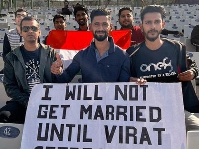 विराटने २०१९ साली बांगलादेश विरूद्ध ईडन गार्डन्सच्या मैदानात १३६ धावांची खेळी केली होती. त्यानंतर त्याला शतक झळकावता आलेले नाही. त्यामुळे सारेच त्याच्या शतकाच्या प्रतिक्षेत आहेत. पण असे असताना विराटच्या एका चाहत्याने आपल्या हातातील फलकामुळे साऱ्यांचेच लक्ष वेधले. चाहते आपल्या आवडत्या खेळाडूसाठी काहीही करू शकतात हे आपण अनेकदा पाहिलं आहे. त्यातच एक नवं उदाहरण समोर आलं. त्या चाहत्याने एका मोठ्या फलकावर लिहिलं होतं की विराट कोहलीने ७१वे आंतरराष्ट्रीय शतक झळकावल्याशिवाय मी लग्न करणार नाही. या चाहत्याचा आणि त्या फलकाचा फोटो चांगलाच व्हायरल झाला.