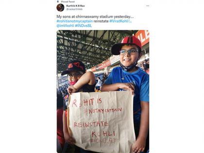 विराट कोहली गेली अनेक वर्षे RCB संघाकडून IPL खेळतो. बंगळुरू हे त्याच्यासाठी होम ग्राउंडच आहे. त्यामुळे त्याला येथे जबरदस्त पाठिंबा मिळताना दिसत आहे. या दरम्यान, रविवारी दोन मुले एक पोस्टर घेऊन बेंगळुरू स्टेडियमवर पोहोचलेली दिसली. त्या पोस्टरवर लिहिलं होतं की, 'रोहित शर्मा आमचा कर्णधार नाही, विराट कोहलीला पुन्हा कर्णधार बनवा.' हा फोटो त्या मुलांच्या वडिलांनी ट्विट केला होता, जो खूप वेगाने व्हायरल झाला.