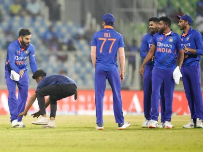 सामना सुरू असताना विराटचा चाहता मैदानावर धावत आला अन् त्याने भारतीय फलंदाजाचे पाय पकडले. यानंतर सूर्याकुमार यादव त्या चाहत्यासाठी फोटोग्राफर बनलेला पाहायला मिळाला.