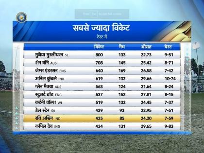 भारताचे माजी कर्णधार आणि वेगवान गोलंदाज कपिल देव यांनी 131 कसोटीत 434 विकेट्स घेतल्या आहेत. त्यात त्यांनी 23 वेळा 5 विकेट्स आणि दोन वेळा 10 विकेट्स घेण्याचा विक्रम केला आहे. तर, आर अश्विनची ही 85वी कसोटी आहे. त्याने आतापर्यंत 435 विकेट घेतल्या आहेत. यात त्याने 30 वेळा 5 आणि 7 वेळा 10 विकेट घेतल्या आहेत. कसोटी क्रिकेटमध्ये सर्वाधिक विकेट्स घेण्याच्या बाबतीत अश्विन सध्या 9व्या क्रमांकावर आहे. श्रीलंकेचा मुथय्या मुरलीधरन 800 बळींसह अव्वल स्थानावर आहे.