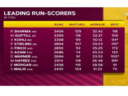 ३३ वी धाव घेताच रोहित आंतरराष्ट्रीय ट्वेंटी-२०त सर्वाधिक धावा करणारा फलंदाज बनला. त्याने ३३९९ धावा करणाऱ्या मार्टिन गुप्तीलला मागे टाकले. रोहितच्या नावावर आता ३४०६* धावा झाल्या आहेत. विराट कोहली ३३०८ धावांसह तिसऱ्या क्रमांकावर आहे.