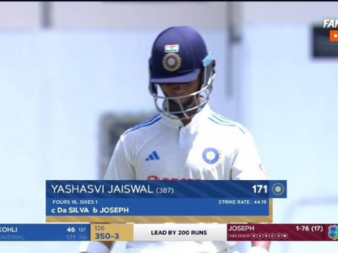 विराटला ४० धावांवर आणखी एकदा जीवदान मिळाले. त्याचा सोपा झेल विंडीजच्या खेळाडूने टाकला. त्यानंतर तो रन आऊट होता होताही वाचला. विंडीजच्या १५० धावांच्या प्रत्युत्तरात एकट्या यशस्वीने १५०+ धावा केल्या. विराट व यशस्वी या जोडीने तिसऱ्या विकेटसाठी शतकी भागीदारी करून विंडीजचे टेंशन वाढवले. यशस्वी ३८७ चेंडूंचा सामना करून १७१ धावांवर झेलबाद झाला. अल्झारी जोसेफने ही महत्त्वाची विकेट मिळवून दिली. (IND vs WI 1st Test Live Scoreboard ) यशस्वीचे दमदार विक्रम....