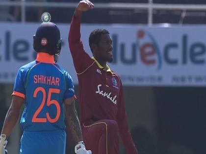 त्यानंतर पॉलने सुरुवातीला विंडीज शैलीत सेलिब्रेशन केले, परंतु धवन नजीक येताच त्याने मांडीवर हात थोपटून नंतर तो वर हवेत केला. एरवी या शैलीने धवन इतरांना डिवचायचा, परंतु आज तो स्वतःच्याच जाळ्यात अडकला. पॉलच्या या शैलीमुळे विंडीज खेळाडूंनाही हसू आवरले नाही.