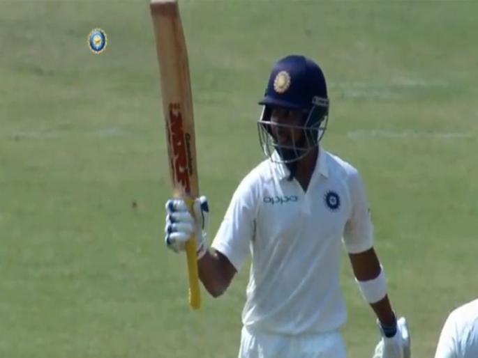 राजकोट, भारत विरुद्ध वेस्ट इंडिज : कसोटी पदार्पणात अर्धशतक झळकावून पृथ्वी शॉ याने आपली निवड योग्य असल्याचे दाखवले. भारत विरुद्ध वेस्ट इंडिज यांच्यातील पहिल्या कसोटी सामन्यात पृथ्वी अनुभवी खेळाडू लोकेश राहुल याच्यासह सलामीला आला. पहिल्याच षटकाच्या अखेरच्या चेंडूवर राहुल पायचीत होऊन माघारी परतल्यानंतर पृथ्वीने सामन्याची सुत्र हाती घेतली. त्याने चेतेश्वर पुजारासह दुसऱ्या विकेटसाठी अर्धशतकी भागीदारी केली. याच दरम्यान त्याने वैयक्तिक अर्धशतकही झळकावले. त्याने 56 चेंडूंत 50 धावांची खेळी केली.