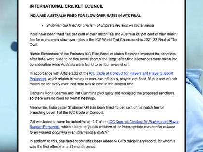 भारतीय संघाने निर्धारित वेळेपेक्षा ५ षटकं कमी टाकले, तर ऑस्ट्रेलियाने ४ षटकं कमी टाकले. आयसीसीच्या नियम क्रमांक २.२२ नुसार प्रत्येक षटकाला २० टक्के मॅच फी ही कापली जाते. त्यानुसार भारतीय संघाची संपूर्ण १०० टक्के मॅच फी कापली गेली आहे. याचा अर्थ भारतीय खेळाडू, सपोर्ट स्टाफ यांना WTC Final चा एक रुपयाही नाही मिळणार. शिवाय भारताचा सलामीवीर शुबमन गिल याच्यावरही कारवाई केली गेली आहे. कसोटीच्या चौथ्या दिवशी गिलच्या विकेटने वादाला फोडणी दिली होती.