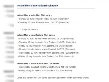 क्रिकेट आयर्लंडने मंगळवारी भारताच्या जूनमधील दौऱ्याची घोषणा केली. जागतिक क्रमवारीत अव्वल क्रमांकावर असलेला भारतायी संघ २६ व २८ जूनला हे दोन सामने खेळणार आहे. ट्वेंटी-२० वर्ल्ड कप स्पर्धेसाठी पात्र ठरलेल्या आयर्लंडने त्यांचे जून-जुलै महिन्यातील वेळापत्रक जाहीर केले. या कालावधीत आयर्लंडचा संघ भारतासह न्यूझीलंड, दक्षिण आफ्रिका व अफगाणिस्तान यांच्याविरुद्ध खेळणार आहे.