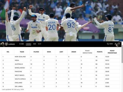 जागतिक कसोटी अजिंक्यपद स्पर्धेच्या गुणतालिकेत भारताने दुसऱ्या क्रमांकावर झेप घेतली आहे. न्यूझीलंडने ७५ टक्क्यांसह अव्वल स्थान पटकावले होते. भारत ५९.५२ टक्क्यांसह दुसऱ्या क्रमांकावर आला असून ऑस्ट्रेलियाला ( ५५ टक्के) त्यांनी मागे ढकलले.