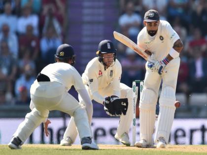 सॅम कुरनने लोकेश राहुलला बाद करताच विराट फलंदाजीला आला. त्याने चेतेश्वर पुजारासह ३१ धावांची छोटेखानी भागीदारी केली. मात्र, जेम्स अँडरसनने एकाच षटकात पुजारा व अजिंक्य रहाणेला बाद केले. त्यानंतर विराटने कसोटी पदार्पण करणाऱ्या हनुमा विहारीसह ५१ धावा जोडल्या. अर्धशतकाच्या उंबरठ्यावर असलेल्या विराटला बेन स्टोक्सने बाद केले. विराटने ७० चेंडूत ४९ धावा केल्या. त्यात ६ चौकारांचा समावेश होता.