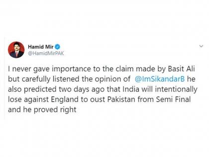 वरिष्ठ पत्रकार हामिद मीर यांनीही भारतीय संघावर टीका केली. ते म्हणाले,''बासीत अली याने काही दिवसांपूर्वी एक दावा केला होता आणि भारताच्या आजच्या खेळीनंतर तो दावा खरा ठरला. पाकिस्तानला उपांत्य फेरीतून बाहेर करण्यासाठी भारतीय संघ मुद्दामून पराभूत होईल, अशी भविष्यवाणी अलीने केली होती. ती खरी ठरली.''