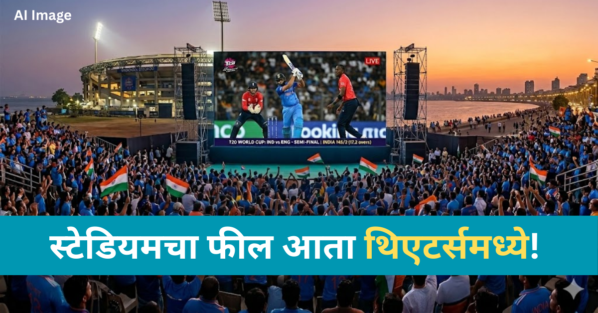 टी-२० विश्वचषकाचा थरार आता अंतिम टप्प्यात आला असून, संपूर्ण जगाचे लक्ष भारत विरुद्ध इंग्लंड यांच्यातील हाय-व्होल्टेज उपांत्य फेरीच्या (सेमीफायनल) सामन्याकडे लागले आहे. ५ मार्च रोजी होणाऱ्या या निर्णायक लढतीसाठी क्रिकेट चाहत्यांमध्ये कमालीची उत्सुकता आहे. वानखेडे स्टेडियमवर हा सामना पाहण्यासाठी हजारो प्रेक्षक गर्दी करण्याची शक्यता असली, तरी स्टेडियमचे तिकीट न मिळालेल्या चाहत्यांसाठी एक मोठी खुशखबर आहे. मुंबईतील तब्बल २९ थिएटर्समध्ये हा सामना लाईव्ह दाखवला जाणार आहे.