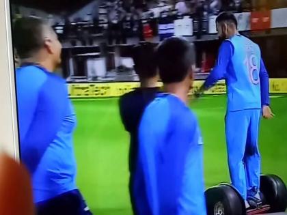 सामना संपल्यावर एका 'सेगवे' या दुचाकीवर उभा राहीला होता. या दुचाकीवरून त्याने मैदानात फेरफटकाही मारला. त्यानंतर कोहलीने चक्क धमेंद्र यांच्या खास स्टाईलमध्ये एक हात डोक्यावर आणि दुसरा हात कंबरेवर ठेवून डान्सही केला.