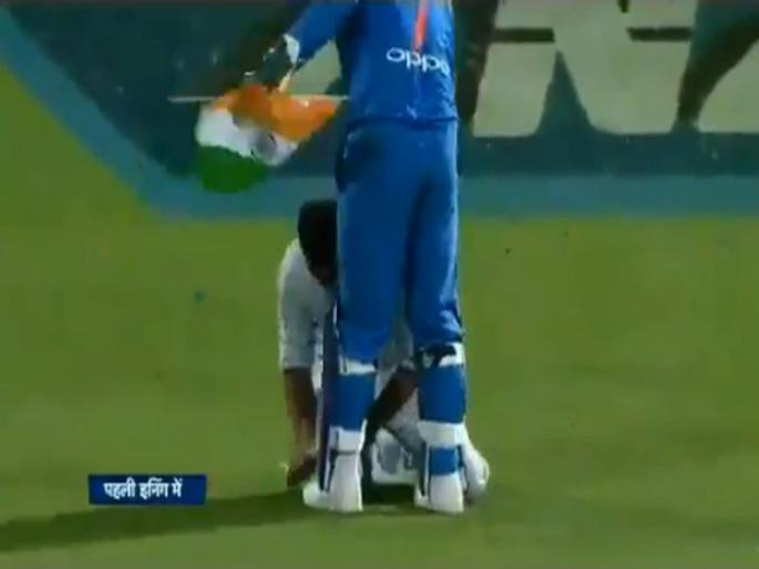 भारताने नाणेफेक जिंकंत प्रथम क्षेत्ररक्षणाचा निर्णय घेतला. सामन्याच्या 14 व्या षटकात मैदानात अचानक एक चाहता धोनीच्या दिशेने धावत आला. चाहत्याच्या हातात भारताचा तिरंगा होता. हा चाहता धावत येत धोनीच्या पाया पडण्यासाठी खाली वाकला. पण त्याच्या या कृत्यामुळे तिरंगा जमिनीवरलोळेल हे लक्षात येताच धोनीने तो चाहताच्या हातातून काढून घेतला.