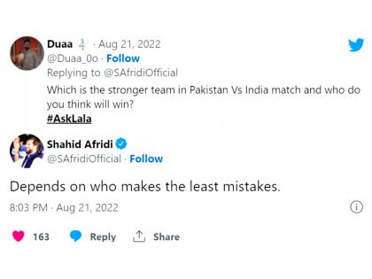 शाहिद आफ्रिदीने ट्विटरवर चाहत्यांच्या प्रश्नांना उत्तरे देताना भारत-पाकिस्तान सामन्यावर आपले मत मांडले. एका क्रिकेट चाहत्याने त्याला भारत-पाक सामन्याच्या निकालावर प्रश्न विचारला, त्याचे उत्तर देताना त्याने वेगळाच 'ट्विस्ट' आणला. इतर वेळी थेट पाकिस्तानी संघाची बाजू घेणारा आफ्रिदी यावेळी मात्र काहीसा वेगळ्या उत्तराच्या मूड मध्ये दिसला. भारत आणि पाकिस्तानच्या सामन्यात सर्वात कमी चुका करणारा संघ जिंकेल, असं विचित्र उत्तर त्याने दिले.