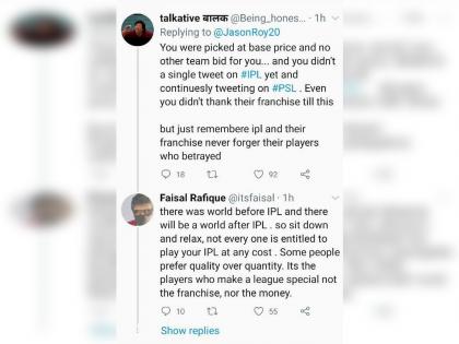 इंग्लंडसाठी तडाखेबाज सलामी देणारा फलंदाज जेसन रॉय याने IPL 2022 मधून माघार घेतली. रॉयला यंदाच्या मेगालिलावात २ कोटींच्या मूळ किमतीवर गुजरात संघाने ताफ्यात घेतलं होतं. शुबमन गिलच्या साथीने तो ओपनिंग करेल असा गुजरात संघाचा प्लॅन होता. पण सुमारे दोन महिने बायो-बबलमध्ये राहावं लागणार या भीतीने त्याने स्पर्धेतून आधीच माघार घेतली. पाकिस्तान सुपर लीग स्पर्धेत जेसन रॉय खेळताना दिसला होता. क्वेट्टा ग्लॅडिएटर्स संघाकडून सर्वाधिक ३०३ धावाही त्याने केल्या. यात एक शतक आणि दोन अर्धशतकांचा समावेश होता. पण IPL मधून त्याने माघार घेतली. त्यामुळे चाहत्यांमध्ये चांगलीच जुंपली. IPL फ्रँचाईसी अशा खेळाडूंची वर्तणूक विसरत नाहीत, अशी धमकीवजा कमेंट भारतीय चाहत्याने केली. तर, प्रत्येक खेळाडूने IPL खेळलंच पाहिजे असा कुठे नियम नाही, असं पाकिस्तानी चाहत्याने लिहिलं.