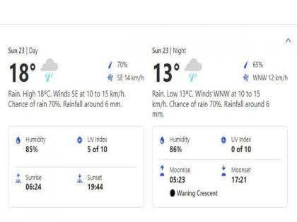 weather.com च्या अंदाजानुसार २३ ऑक्टोबर म्हणजेच रविवारी मेलबर्नमध्ये पावसाची शक्यता आहे. रविवारी मेलबर्नमध्ये दुपारच्या सुमारास वातावरण १८ डिग्री इतकं राहील. याच वेळी पावसाचा अंदाज ७० टक्के इतका वर्तविण्यात आला आहे. ६ मिमी इतका पाऊस पडू शकतो असा अंदाज आहे. फक्त दिवसाच नव्हे, तर रात्री देखील पावसाची शक्यता वर्तविण्यात आली आहे. यादरम्यान हवेचा वेग १५ केएमपीएच इतका असू शकतो.