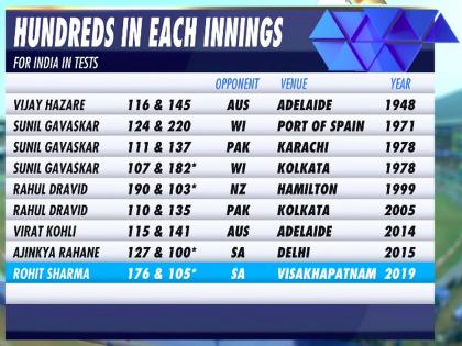 भारत विरुद्ध दक्षिण आफ्रिका, रोहित शर्मानं दुसऱ्या डावातही शतकी खेळी करून इतिहास घडवला. सलामीवीर म्हणून एकाच कसोटीच्या दोन्ही डावात शतक करणारा सहा भारतीय फलंदाज ठरला. पण, प्रथमच सलामीला येत पहिल्याच सामन्यात अशी कामगिरी करणाऱ्या पहिल्या भारतीय फलंदाजाचा मान त्यानं पटकावला. रोहितनं पहिल्या डावात 176 धावा केल्या होत्या आणि दुसऱ्या डावात त्यानं शतकी खेळी साकारली आहे. कसोटी क्रिकेटमधील रोहितचे हे पाचवे शतक आहे. सलामीवीर म्हणून त्याचे हे दुसरे आणि आफ्रिकेविरुद्धचेही दुसरे शतक आहे. कोहलीच्या नेतृत्वाखाली खेळताना त्यानं तीन शतकं केली आहेत.