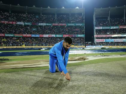 भारत विरुद्ध श्रीलंका यांच्यातल्या पहिल्या ट्वेंटी-20 सामन्यात पावसानं खोडा घातला. नाणेफेकीचा कौल टीम इंडियाच्या बाजूनं लागला आणि विराट कोहलीनं प्रथम गोलंदाजी करण्याचा निर्णय घेतला. पण, त्यानंतर पावसानं एन्ट्री मारली. पावसाच्या दमदार एन्ट्रीनं चाहते निराश झाले. पावसाचा लपंडाव सुरूच राहिला. टीम इंडियाचा कर्णधार विराट कोहली दोन वेळा पंचांसोबत खेळपट्टीची पाहणी करण्यासाठी मैदानावर उतरला. पावणेदहा वाजता जेव्हा विराट कोहली पंचांसोबत खेळपट्टीची पाहणी करण्यासाठी मैदानावर आला त्यावेळी तो नाखुश दिसला.