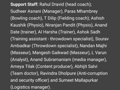 राहुल द्रविडची सपोर्ट टीम - राहुल द्रविड ( मुख्य प्रशिक्षक), सुधीर आसनानी ( प्रबंधक), पारस म्हाम्ब्रे ( गोलंदाजी प्रशिक्षक), टी दिलीप ( क्षेत्ररक्षण प्रशिक्षक), आशीष कौशिक ( फिजिओ), नारायण पंडित ( फिजिओ), आनंद दाते ( ट्रेनर), एआय हर्ष ( ट्रेनर), अशोक साध ( सहाय्यक प्रशिक्षक - थ्रोडाऊन स्पेशालिस्ट), सौरव अंबडकर ( थ्रोडाऊन स्पेशालिस्ट), नंदन मांझी ( मालीश), मंगेश गायकवाड ( मालीश), एल वरूण ( विश्लेषक), आनंद सुब्रमण्यम ( मीडिया व्यवस्थापक), अमेय तिलक ) कंटेंट प्रोडुसर), अभिजीत साळवी ( टीम डॉक्टर), रवींद्र धोलपूरे ( भ्रष्टाचार विरोधी आणि सुरक्षा अधिकारी), सुमीत मल्लापुरकर ( लॉजिस्टिक्स मॅनेजर).