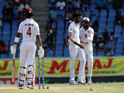 अँटिग्वा, भारत विरुद्ध वेस्ट इंडिज : जसप्रीत बुमराहच्या भेदक माऱ्यासमोर वेस्ट इंडिजच्या फलंदाजांनी सपशेल शरणागती पत्करली. उप कर्णधार अजिंक्य रहाणेची ( 102) शतकी खेळी आणि हनुमा विहारी ( 93) व कर्णधार विराट कोहली ( 51) यांच्या अर्धशतकी खेळीच्या जोरावर भारताने 419 धावांचे आव्हान उभे केले. 420 धावांचे लक्ष्य पाहूनच वेस्ट इंडिज संघाचे धाबे दणाणले होते, त्या बुमराहने त्यांना हतबल केले. बुमराहने अवघ्या 7 धावा देत विंडीजचा निम्मा संघ माघारी पाठवला. त्यानंतर इशांत शर्मा व मोहम्मद शमी यांनी विंडीजचा डाव 100 धावांत गुंडाळण्यात हातभार लावला. भारताने 318 धावांनी हा सामना जिंकून मालिकेत 1-0 अशी आघाडी घेतली आहे. या सामन्यात भेदक गोलंदाजी करणाऱ्या बुमराहने विश्वविक्रमाची नोंद केली.