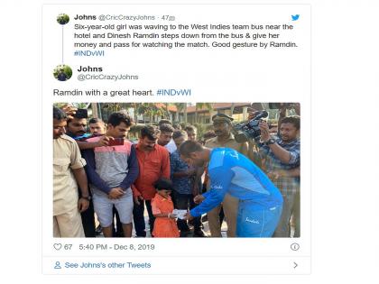 आता दुसऱ्या सामन्यात विजय मिळवून मालिकेतील आव्हान टीकवण्याचा प्रयत्न वेस्ट इंडिजला करावा लागणार आहे. विंडीजनं पहिल्या सामन्यात फलंदाजीत आपली कामगिरी चोख बजावली, परंतु गोलंदाजीत त्यांना अपयश आले. कर्णधार किरॉन पोलार्डनंही गोलंदाजांचे चांगलेच कान टोचले आहेत. या सामन्यासाठी दोन्ही संघ जेव्हा मैदानावर दाखल होत होते, तेव्हा स्टेडियमबाहेर एका सहा वर्षाच्या चिमुरडीनं विंडीजच्या दिनेश रामदिनचं लक्ष वेधलं. त्यानं संघाच्या बसमधून खाली उतरून त्या मुलीची भेट घेतली अन् तिला थोडे पैसे व सामन्याचे तिकीट गिफ्ट केले. त्याची ही कृती पाहून सर्वांची मनं जिंकली.