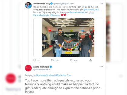 रविवारी मोहम्मद सिराजच्या  घरी महिंद्रा थार पोहोचली आणि भारतीय गोलंदाजानं आनंद महिंद्रा यांचे आभार मानले. तो म्हणाला,''या क्षणाला नक्की काय बोलू, हेच सुचत नाही. ही भेट मिळाल्यानंतर किती आनंद झालाय, हे मी व्यक्त करू शकत नाही. मी आनंद महिंद्रा सर यांचे आभार मानतो. ''