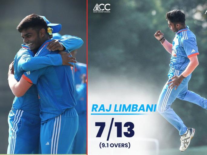 Asian Cricket Council Under-19s Asia Cup - भारतीय संघाने १९ वर्षांखालील आशिया चषक स्पर्धेत आज नेपाळवर पाकिस्तानविरुद्धच्या पराभवाचा सर्व राग काढला. भारतीय गोलंदाज राज लिंबानी ( Raj Limbani) याने १३ धावांत ७ विकेट्स घेत नेपाळचा संपूर्ण डाव २२.१ षटकांत गुंडाळला. राजने ९.१ षटकांत १३ धावा देत एकूण ७ बळी घेतले. त्याने ११ धावांच्या आत ७ विकेट घेतल्या. त्याने त्याच्या चौथ्या षटकात विकेटचे खाते उघडले आणि त्यापूर्वी आधीच्या ३ षटकांत त्याने केवळ २ धावा दिल्या होत्या. त्याच्या गोलंदाजीसमोर नेपाळचा संघ ५२ धावांत सर्वबाद झाला. नेपाळच्या ५२ धावांत १३ अतिरिक्त धावा होत्या.