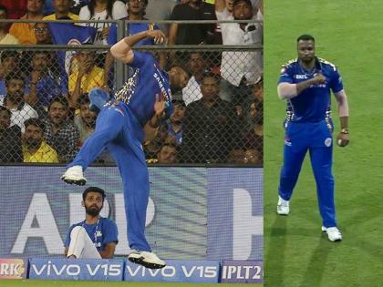 मुंबई-चेन्नई सामन्यात लक्षवेधी ठरला, तो पोलार्डने घेतलेला सुरेश रैनाचा भन्नाट झेल. हवेतून सीमेपार जात असलेला चेंडू पोर्लाडनं उंच उडी मारत एका हातात टिपला. तो पाहून रैनाचा चेहराच पडला, तर मुंबईने जल्लोष केला. त्याआधी शेन वॉटसनचा झेलही उंच-धिप्पाड पोलार्डनं जबरदस्त घेतला होता. मुंबईला १७० धावांपर्यंत पोहोचवण्यातही त्याच्या फटकेबाजीचा मोलाचा वाटा होता.