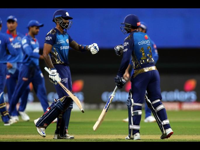 प्रथम फलंदाजीला आलेल्या शिखर धवन ( ६९) आणि कर्णधार श्रेयस अय्यर ( ४२) यांनी खिंड लढवताना दिल्लीला २० षटकांत ४ बाद १६२ धावांचा पल्ला गाठून दिला. प्रत्युत्तरात रोहित शर्मा ( ५) लगेच माघारी परतला तरी क्विंटन डी'कॉक आणि सूर्यकुमार यादव यांनी दिल्लीच्या गोलंदाजांना धु धु धुतले. या दोघांनी दुसऱ्या विकेटसाठी ४६ धावा जोडल्या. आर अश्विननं ही भागीदारी तोडली. क्विंटन ३६ चेंडूंत ४ चौकार व ३ षटकारांसह ५३ धावांवर माघारी परतला. यादवने ३२ चेंडूंत ६ चौकार व १ षटकार खेचून ५३ धावा केल्या. इशान किशनने १५ चेंडूंत २ चौकार व २ षटकार खेचून २८ धावांची खेळी केली. त्यांच्यामुळे मुंबईने ५ विकेट्स राखून सामना जिंकला.