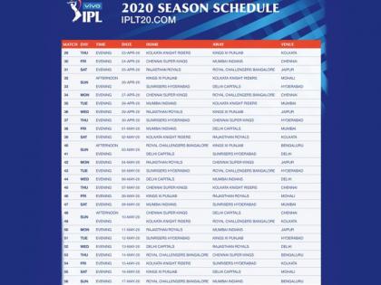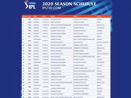 इंडियन प्रीमिअर लीग 2020चं प्रतिक्षेत असणारं अधिकृत वेळापत्रक अखेर जाहीर करण्यात आलं. मुंबई इंडियन्स आणि चेन्नई सुपर किंग्स यांच्यात सलामीचा सामना 29 मार्चला मुंबईच्या वानखेडे स्टेडियवर रंगणार आहे. 17 मे रोजी अखेरचा साखळी सामना रॉयल चॅलेंजर्स बंगळुरू विरुद्ध मुंबई इंडियन्स यांच्यात एम चिन्नास्वामी स्टेडियमवर खेळवण्यात येईल.