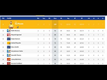 ऑरेंज कॅपच्या शर्यतीत चेन्नई सुपर किंग्सचा ( Chennai Super Kings) फॅफ डू प्लेसिल ( Faf du Plessis) अव्वल स्थानावर आहे. त्याने दोन सामन्यांत 130 धावा केल्या आहेत. रोहित शर्मा 92 धावांसह दुसऱ्या, तर किंग्स इलेव्हन पंजाबचा मयांक अग्रवाल ( 89) तिसऱ्या क्रमांकावर आहे.